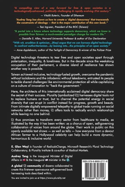 Digital technology threatens to tear free and open societies apart through polarization, inequality, and loneliness. But in the decade since the weekslong occupation of their parliament, a diverse island of resilience has shown another way is possible. Taiwan achieved inclusive, technology-fueled growth, overcame the pandemic without lockdowns and the infodemic without takedowns, entrusted its people to tackle shared challenges like environmental protection while capitalizing on a culture of innovation to "hack the government." Here, the architects of Taiwan's internationally acclaimed digital democracy share the secret of their success. Plurality (symbolized ¿) harnesses digital tools not to replace humans or trust, but to channel the potential energy in social diversity that can erupt in conflict instead for progress, growth and beauty. From intimate digitally empowered telepathy to global trade running on social networks rather than money, ¿ offers tools to radically enrich relationships while leaving no one behind. ¿ thus promises to transform every sector from healthcare to media, as illustrated by the way it has been written: as a chorus of open, self-governing collaboration of voices from around the globe. Their work in public on this openly available text shows - as well as tells - how everyone from a devout African farmer to a Hollywood celebrity can help build a more dynamic, harmonious and inclusive world. E. Glen Weyl is Founder of RadicalxChange, Microsoft Research's Plural Technology Collaboratory, & Plurality Institute & co-author of Radical Markets. Audrey Tang is the inaugural Minister of Digital Affairs in Taiwan & the inaugural minister in the ¿¿¿¿. A global ¿ community of dozens did a majority of the work to create this first-ever open-source, copyright-free, self-governed book harnessing tools described within. Their images were digitally blended and then tiled to create the above image. ¿You are invited to join us at https://www.plurality.net