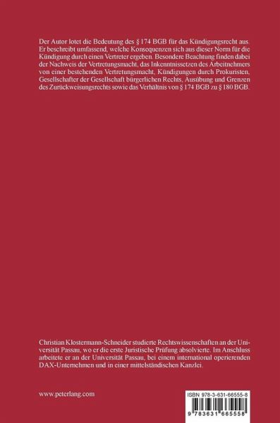 174 BGB für das Kündigungsrecht aus. Er beschreibt umfassend, welche Konsequenzen sich aus dieser Norm für die Kündigung durch einen Vertreter ergeben. Besondere Beachtung finden dabei der Nachweis der Vertretungsmacht, das Inkenntnissetzen des Arbeitnehmers von einer bestehenden Vertretungsmacht, Kündigungen durch Prokuristen, Gesellschafter der Gesellschaft bürgerlichen Rechts, Ausübung und Grenzen des Zurückweisungsrechts sowie das Verhältnis von