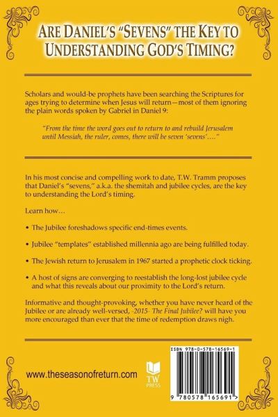 Scholars and would-be prophets have been searching the Scriptures for ages trying to determine when Jesus will return-most of them ignoring the plain words spoken by Gabriel in Daniel 9: "From the time the word goes out to return to and rebuild Jerusalem until Messiah, the ruler, comes, there will be seven 'sevens'..." In his most concise and compelling work to date, T.W. Tramm proposes that Daniel's "sevens," a.k.a. the shemitah and jubilee cycles, are the key to understanding the Lord's timing. Learn how: the Jubilee foreshadows specific end-times events; jubilee "templates" established millennia ago are being fulfilled today; also, how a host of signs are converging to reestablish the long-lost jubilee cycle and what this reveals about our proximity to the Lord's return. Informative and thought provoking, whether you have never heard of the Jubilee or are already well-versed, "-2015- The Final Jubilee?" will have you more encouraged than ever that the time of redemption draws nigh.