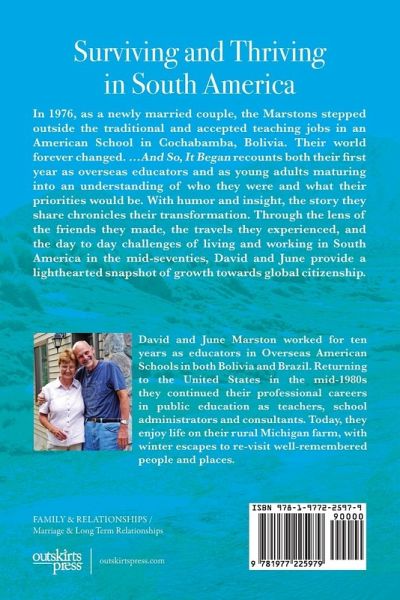 As a young married couple in 1976, David and June Marston shocked their family and friends by abandoning the predictable Midwestern life laid out before them and accepting teaching jobs in an American school in Cochabamba, Bolivia. The life stories of fascinating people met, the adventure of travel opportunities undertaken, and the joy of activities encountered would redefine them personally and professionally. The honest storytelling is one of enlarging moments, the humor of inexperience, and unexpected resilience that propelled the Marstons into the rest of their lives. ...And So It Began Moments Well Lived: Recollections of Living, Teaching, and Traveling in South America focuses on the timeless human need to understand ourselves and others and illuminates the fact that we are not that much different from each other. The book is perfect for adults nostalgic for the 1970s and 1980s and those interested in seeing today through the history that brought us to this moment. The memoir conveys more than just the day-to-day details of expat life. It also touches on the universality of the human experience.