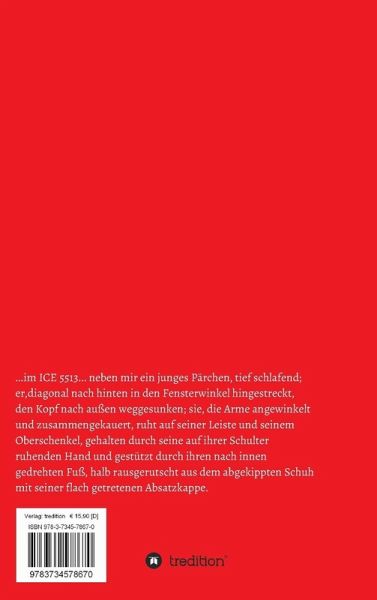 ...im ICE 5513... neben mir ein junges Pärchen, tief schlafend; er, diagonal nach hinten in den Fensterwinkel hingestreckt, den Kopf nach außen weggesunken; sie, die Arme angewinkelt und zusammengekauert, ruht auf seiner Leiste und seinem Oberschenkel, gehalten durch seine auf ihrer Schulter ruhenden Hand und gestützt durch ihren nach innen gedrehten Fuß, halb rausgerutscht aus dem abgekippten Schuh mit seiner flach getretenen Absatzkappe.