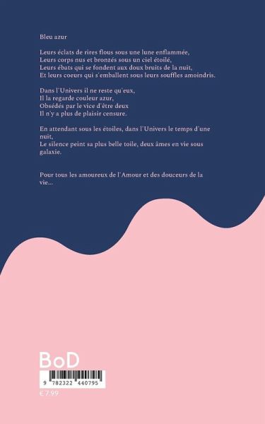 Bleu azurLeurs éclats de rires flous sous une lune enflammée,Leurs corps nus et bronzés sous un ciel étoilé, Leurs ébats qui se fondent aux doux bruits de la nuit, Et leurs coeurs qui s'emballent sous leurs souffles amoindris. Dans l'Univers il ne reste qu'eux, Il la regarde couleur azur, Obsédés par le vice d'être deuxIl n'y a plus de plaisir censure. En attendant sous les étoiles, dans l'Univers le temps d'une nuit, Le silence peint sa plus belle toile, deux âmes en vie sous galaxie.Pour tous les amoureux de l'Amour et des douceurs de la vie...
