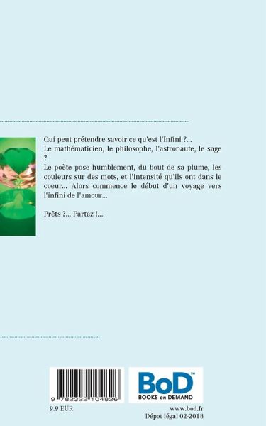 Qui peut prétendre savoir ce qu'est l'Infini ?... Le mathématicien, le philosophe, l'astronaute, le sage ?Le poète pose humblement, du bout de sa plume, les couleurs sur des mots, et l'intensité qu'ils ont dans le coeur... Alors commence le début d'un voyage vers l'infini de l'amour...Prêts ?... Partez !...