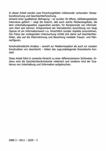 In dieser Arbeit werden zwei Forschungsfelder miteinander verbunden: Rezeptionsforschung und Geschlechterforschung. Anhand einer qualitativen Befragung ¿ es wurden 30 offene, leitfadengestützte Interviews geführt ¿ zeigt die Autorin, dass auch solche Medienangebote, die dem Unterhaltungssektor zugeordnet werden, für Rezipierende von informativem Wert sein können. Entsprechend der thematischen Ausrichtung von Soap Operas ist ein Informationswert v.a. hinsichtlich sozialer Aspekte anzunehmen. Der Fokus der vorliegenden Untersuchung richtet sich daher auf Geschlechterbilder, also auf die Wahrnehmung und Bewertung medialer Frauen- und Männerfiguren. Konstruktivistische Ansätze ¿ sowohl zur Medienrezeption als auch zur sozialen Konstruktion von Geschlecht ¿ bilden das zugrundeliegende theoretische Konzept. Diese Arbeit führt in zweierlei Hinsicht zu einer differenzierteren Sichtweise: Erstens wird die Geschlechterdichotomie relativiert und zweitens wird der Dualismus von Unterhaltung und Information aufgebrochen.