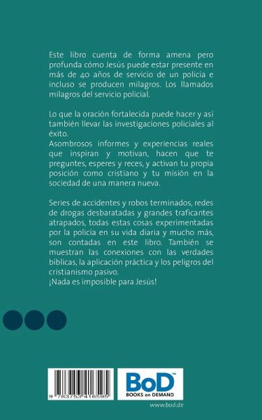 Este libro cuenta de forma amena pero profunda cómo Jesús puede estar presente en más de 40 años de servicio de un policía e incluso se producen milagros. Los llamados milagros del servicio policial. Lo que la oración fortalecida puede hacer y así también llevar las investigaciones policiales al éxito. Asombrosos informes y experiencias reales que inspiran y motivan, hacen que te preguntes, esperes y reces, y activan tu propia posición como cristiano y tu misión en la sociedad de una manera nueva. Series de accidentes y robos terminados, redes de drogas desbaratadas y grandes traficantes atrapados, todas estas cosas experimentadas por la policía en su vida diaria y mucho más, son contadas en este libro. También se muestran las conexiones con las verdades bíblicas, la aplicación práctica y los peligros del cristianismo pasivo. ¡Nada es imposible para Jesús!