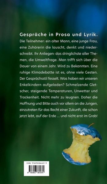 Gespräche in Prosa und Lyrik. Die Teilnehmer: ein alter Mann, eine junge Frau, eine Zuhörerin die lauscht, denkt und niederschreibt. Ihr Anliegen: das dringlichste aller Themen, die Umweltfrage. Man trifft sich über die Dauer von einem Jahr. Wird zu Bekannten. Eine ruhige Klimadebatte ist es, ohne viele Gesten. Der Gesprächsstil fesselt. Was haben wir unseren Enkelkindern aufgeladen? Schmelzende Gletscher, steigende Temperaturen, Unwetter und Trockenheit. Nicht mehr zu leugnen. Daher die Hoffnung und Bitte auch vor allem an die Jungen, einzutreten für das Recht einer Zukunft, die schon jetzt lebt, auf der Erde ... und nicht erst im Grab!