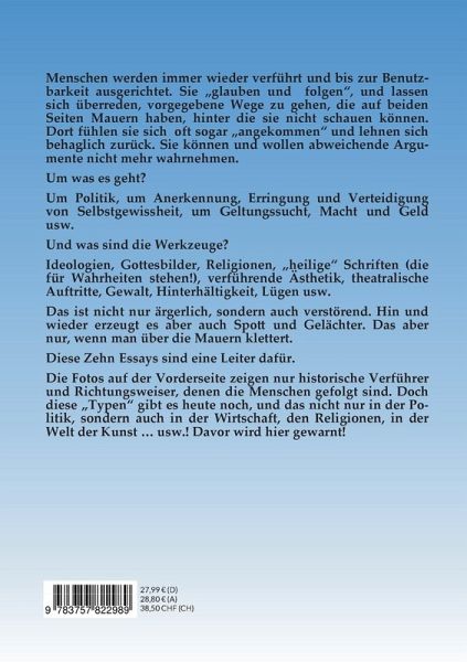 Menschen werden immer wieder verführt und bis zur Benutzbarkeit ausgerichtet. Sie glauben und folgen, und lassen sich überreden, vorgegebene Wege zu gehen, die auf beiden Seiten Mauern haben, hinter die sie nicht schauen können. Dort fühlen sie sich oft sogar angekommen und lehnen sich behaglich zurück. Sie können und wollen abweichende Argumente nicht mehr wahrnehmen. Um was es geht? Um Politik, um Anerkennung, Erringung und Verteidigung von Selbstgewissheit, um Geltungssucht, Macht und Geld usw. Und was sind die Werkzeuge?Ideologien, Gottesbilder, Religionen, heilige Schriften, die für Wahrheiten stehen, verführende Ästhetik, theatralische Auftritte, Gewalt, Hinterhältigkeit, Lügen usw.Das ist nicht nur ärgerlich, sondern auch verstörend. Hin und wieder erzeugt es aber auch Spott und Gelächter. Das aber nur, wenn man über die Mauern klettert. Diese Zehn Essays sind eine Leiter dafür.