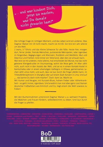 Die richtige Frage im richtigen Moment, und das Leben wird ein anderes. Was Dagmar Walser mit 19 nicht macht, macht sie mit 65. Sie reist ein Jahr alleine um die Welt.2 Jeans, 3 T-Shirts und das Kleine Schwarze für alle Fälle. Heute hier, morgen dort, ferne Länder, fremde Menschen, pulsierende Metropolen, oder irgendwo im Nirgendwo. Begegnungen und Alleinsein, Rückblick und Weitblick, Mut und Übermut und Freiheit. Und immer ein Tellerrand, über den sie schauen kann.Mal reist sie mit anderen, meist alleine, mal entscheidet die Münze, mal das nicht gelesene Kleingedruckte im Visumsantrag, wohin die Reise geht. Ihr Alter zählt nicht, auch nicht in den Hostels der Welt, und sei es in einem Kontakt-Hostel in Kamtschatka oder in einem ehemaligen Gefängnis in Ottawa, gemeinsames Lachen zählt umso mehr, und auch, dass sie laut durch die Finger pfeifen kann, im Trillerpfeifenwahnsinn in Shanghai oder auf einem Slash Konzert in Lima. Und auf "... das kannst Du doch nicht machen". Doch. Kann sie. Macht sie.Mit Humor und Neugier, mit Kurzzeit-Blues, hohem Fieber oder Höhenkrankheit - es geht immer, irgendwie. Und erwähnt man mal eben ganz cool Namen deutscher Fußballstars wie Kimmich und Co, liegt einem die Welt sowieso zu Füßen!