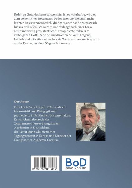 Reden zu Gott, das kann schwer sein. Ist es wahrhaftig, wird es zum persönlichen Bekenntnis. Reden über die Welt fällt nicht leichter. Ist es verantwortlich, drängt es über das Selbstgespräch hinaus, will öffentlich werden und verlangt nach einer Form. Neunundvierzig protestantische Prosagedichte reden zum verborgenen Gott über eine unvollkommene Welt. Fragend, kritisch und reflektierend suchen sie Worte und Antworten, trotz all der Kreuze, auf dem Weg nach Emmaus.