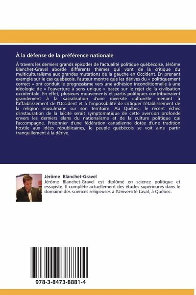 À travers les derniers grands épisodes de l'actualité politique québécoise, Jérôme Blanchet-Gravel aborde différents thèmes qui vont de la critique du multiculturalisme aux grandes mutations de la gauche en Occident. En prenant exemple sur le cas québécois, l'auteur montre que les dérives du " politiquement correct " ont conduit le progressisme vers une adhésion inconditionnelle à une idéologie de " l'ouverture à sens unique " basée sur le rejet de la civilisation occidentale. En effet, plusieurs mouvements et partis politiques contribueraient grandement à la sacralisation d'une diversité culturelle menant à l'affaiblissement de l'Occident et à l'impossibilité de critiquer l'établissement de la religion musulmane sur son territoire. Au Québec, le récent échec d'instauration de la laïcité serait symptomatique de cette aversion profonde envers les derniers élans du nationalisme et de la culture politique qui l'accompagne. Prisonnier d'une fédération canadienne dotée d'une tradition hostile aux idées républicaines, le peuple québécois se voit ainsi partir tranquillement à la dérive.