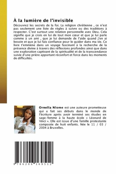 Découvrez les secrets de la foi. La religion chrétienne , ce n'est pas seulement une liste de règles à suivre ou des traditions à respecter. C'est surtout une relation personnelle avec Dieu. Cela signifie que je crois en lui de tout mon coeur et que je lui parle comme à un ami , que je lui demande de l'aide quand j'en ai besoin et que je lui fais confiance pour le guider dans ma vie. Ce livre t'emmène dans un voyage fascinant à la recherche de la présence divine à travers des réflexions profondes ainsi que dans une exploration captivant de la spiritualité et de la transcendance suivie d'une prière apportant réconfort et force dans les moments de difficultés.