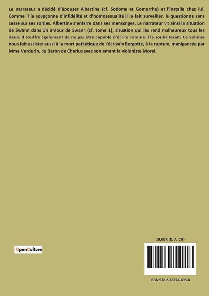 Le narrateur a décidé d¿épouser Albertine (cf. Sodome et Gomorrhe) et l¿installe chez lui. Comme il la soupçonne d¿infidélité et d¿homosexualité il la fait surveiller, la questionne sans cesse sur ses sorties. Albertine s¿enferre dans ses mensonges. Le narrateur vit ainsi la situation de Swann dans Un amour de Swann (cf. tome 1), situation qui les rend malheureux tous les deux. Il souffre également de ne pas être capable d¿écrire comme il le souhaiterait. Ce volume nous fait assister aussi à la mort pathétique de l¿écrivain Bergotte, à la rupture, manigancée par Mme Verdurin, du Baron de Charlus avec son amant le violoniste Morel.