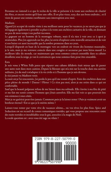 Personne ne s'attend à ce que le reclus de la ville se présente à la vente aux enchères de charité des fêtes, et encore moins qu'il fasse une offre. Il est plus vieux, sexy, dur aux bons endroits... et il vient de passer une somme exorbitante sans interruption avec moi. Madison Quand j'ai accepté de rendre visite à ma meilleure amie pour les vacances, je ne savais pas que je m'engageais également à prendre sa place à la vente aux enchères caritative de la ville, en donnant un peu de mon temps à un parfait inconnu. Le gagnant est un homme de la montagne robuste, mais il n'a rien à voir avec ce à quoi je m'attendais. Plus j'en apprends sur lui, plus j'ai envie d'explorer cette nouvelle attraction et de voir si son baiser est aussi incroyable que la sombre promesse dans ses yeux. Lorsqu'il disparaît en haut de la montagne vers un endroit où vivent des hommes maussades, je le suis, mais je me retrouve coincée dans une congère et secourue par mon héros massif. La meilleure idée du monde, car maintenant que nous sommes coincés ensemble dans sa cabane douillette sous la neige, je vais le convaincre que nous sommes faits pour être ensemble. Ezra Je suis venu à White Falls parce que réparer une cabane délabrée était mieux que de passer une autre nuit dans mon camion. Depuis la blessure qui m'a mis sur la touche dans ma carrière militaire, j'ai du mal à m'adapter à la vie civile et à l'homme que je suis devenu. Je n'ai jamais vu Madison venir. La nuit où je l'ai rencontrée, j'ai perdu le peu qu'il me restait d'esprit. Faire des enchères dans une pièce pleine de monde ? Danser ? Flirter ? Ce n'est pas moi, alors je me retire dans ce qui est confortable. Sauf que la beauté pulpeuse refuse de me laisser dans ma solitude. Elle s'invite à ma fête de pitié et me fait me sentir comme l'homme que j'étais autrefois. Elle me fait voir ce que pourrait être son existence à mes côtés. Mais je ne guérirai peut-être jamais. Comment puis-je la laisser rester ? Puis-je vraiment avoir un bonheur éternel ? Est-ce que je le mérite même ? Laissez-vous tenter par votre rêve de vacances ultime... ou vos rêves les plus fous. Spice and Seduction est un recueil de contes romantiques torrides, qui vous propose une rencontre entre des nuits torrides et inoubliables sous le gui, associées à la magie de Noël. La seule question est : avez-vous été sage ou vilain ?