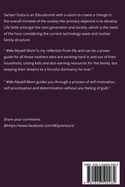# Me-Myself-Mom is my reflection from life and can be a power guide for all those women who are working hard in and out of their house-hold, raising kids and also earning resources for the family, but keep their dreams in a forceful dormancy for ever. Not able to come out of the "fear " of being singled out and limiting beliefs of conventionalism often keep them far away from even taking the first step towards their deepest desires for themselves.They spend the whole life thinking that it was never destined to happen. #Me-Myself-Mom guides you though a process of self motivation, self prioritization and determination without any feeling of guilt . As an author this is my first initiative to reach out to all the Super-MOMS who has the potential to become OUTSTANDING and create a mark in the society by exploring their DEEPEST SELF....and hence be a part of a changed world. Moving ahead , #Me-Myself-Mom will be a community of MOM-preneurs who would share their experiences to inspire more and more women to control the steering of their life. I foresee #Me-Myself-Mom as a platform for MOM-preneurs worldwide to kindle the light of inspiration and CHANGE. Sarbari Dutta Educationist,Entrepreneur,Author.