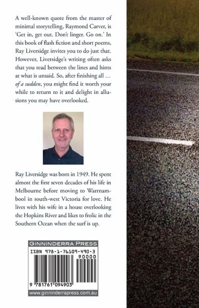 A well-known quote from the master of minimal storytelling, Raymond Carver, is 'Get in, get out. Don't linger. Go on.' In this book of flash fiction and short poems, Ray Liversidge invites you to do just that. However, Liversidge's writing often asks that you read between the lines and hints at what is unsaid. So, after finishing all ...of a sudden, you might find it worth your while to return to it and delight in allusions you may have overlooked.