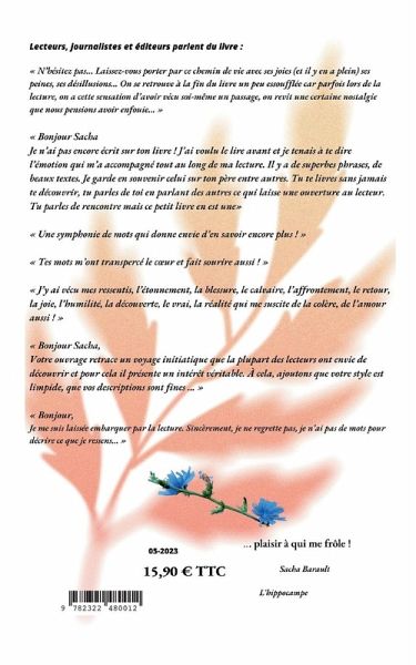 Ce qu'ils en disent :...Laissez vous porter par ce chemin de vie avec ses joies (et il y en a plein), ses peines, ses désillusions...On se retrouve à la fin du livre un peu essouflée car parfois, lors de la lecture, on a cette sensation d'avoir vécu soi-même un passage, on revit une nostalgie que nous pensions avoir enfouie...Votre livre retrace un voyage initiatique que la plupart des lecteurs ont envie de découvrir. Votre style est limpide, vos descriptions sont fines......et je me suis laissé embarquer par la lecture. Je n'ai pas de mots pour décrire ce que je ressens......je tenais à te dire l'émotion qui m'a accompagné tout au long de ma lecture. Il y a de superbes phrases, de beaux textes. Je garde en souvenir celui sur ton père. Tu te livres sans jamais te découvrir, ce qui laisse l'ouverture au lecteur. Tu parles de rencontre mais ce livre en est une......tes mots m'ont transpercé le coeur et fait sourire aussi......une symphonie de mots qui donne envie d'en savoir plus...