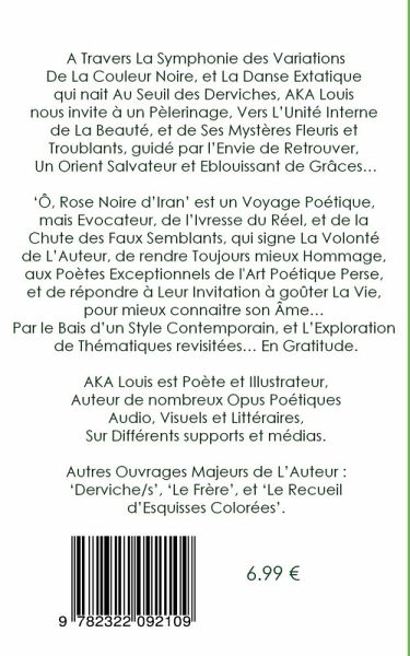 'Ô, Rose Noire d'Iran', est un Voyage poétique, mais évocateur, de l'ivresse du Réel, et de la chute des faux semblants, qui signe la volonté de l'Auteur, de rendre toujours mieux hommage, aux Poètes exceptionnels de l'Art Poétique Perse, et de répondre à leur invitation à goûter la vie, pour mieux connaitre son âme, par le biais d'un style contemporain, et l'exploration de thématiques revisitées, en gratitude.