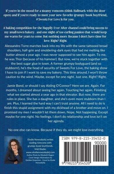 Are you ready for your next grumpy book boyfriend? A baking competition for the Happily Ever After channel could bring success to my small-town bakery... and one night of toe-curling passion that would keep me warm for years to come. But could it bring me love, too? Alessandro Torre marches back into my life with the same tattooed broad shoulders, half-grin and smoldering-dark eyes that had me melting like butter seven months ago. I was never supposed to see him again. To me, he was Thor (because of his hammer). But now, we're stuck together with the best sugar glue in town. A former grumpy bodyguard (and so stubborn!), he's the head of security of Sweets For Love, the baking show I have to join if I want to save my bakery. This time around, I won't throw caution to the wind. Maybe, except for one night. Just one. Right? Right. Jamie Bond, or should I say Aisling O'Connor? Here we are. Again. For months, I dreamed about seeing her again. Touching her again. Finishing what we started almost a year ago in that elevator. But now, there are rules in place. She has a daughter, and she's even more stubborn than I am. Plus, I learned the hard way I can't trust anyone. All I need to do is finish this stupid assignment with my dickhead of a brother and move on. I promised my men I wouldn't let them down. Nope. Not happening. Except maybe for one night. No feelings. I don't do relationship and love isn't on her agenda. No one else can know. Because if they find out, we might lose everything.