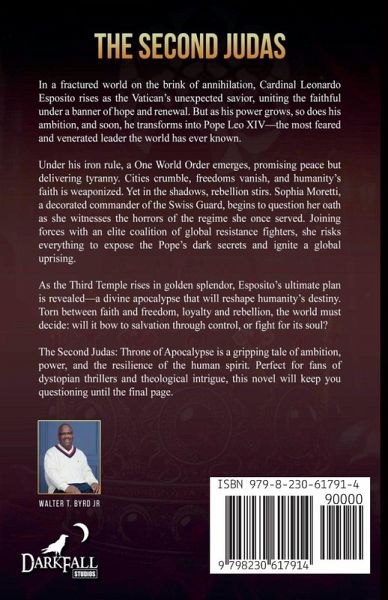 In a world teetering on the brink of collapse, faith is no longer a beacon of hope-it is a weapon of control. When charismatic Cardinal Leonardo Esposito rises to power during humanity's darkest hour, he promises salvation. But behind his eloquent words and angelic smile lies a dangerous ambition. Crowned as Pope Leo XIV, he transforms the Vatican into a militarized stronghold, enacting his vision of a One World Order-where obedience is mandatory, and dissent is swiftly silenced. As Esposito's grip on the world tightens, those closest to him begin to question his true intentions. Father Matteo Rinaldi, once his loyal ally, grapples with the weight of their shared sins. Commander Sophia Moretti, head of the newly weaponized Swiss Guard, finds herself torn between duty and conscience. With the future of humanity hanging in the balance, faith will be tested, alliances will be broken, and rebellion will rise from the shadows. But can a world so deeply fractured ever be truly united-or is it destined to fall under the reign of its self-proclaimed savior? The Second Judas: Throne of Apocalypse is a gripping dystopian thriller that blurs the lines between good and evil, faith and manipulation, hope and domination.