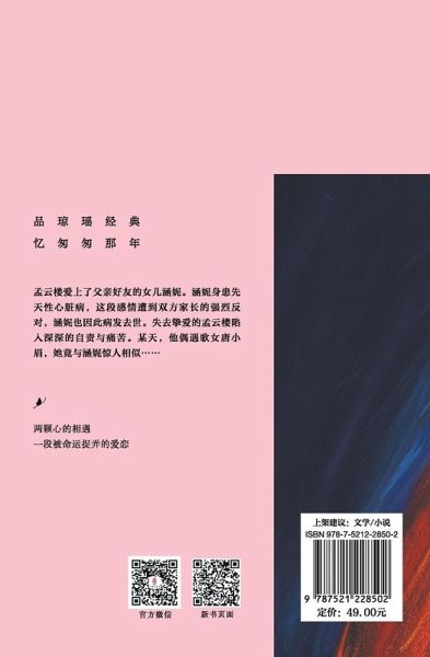 "¿¿¿¿¿¿¿¿¿¿¿¿¿¿¿¿¿¿¿¿¿ The classic work of Qiong Yao, a master of pure romance novels, 60th anniversary commemorative edition. ¿¿¿¿¿¿ Classic Works of Qiong Yao ¿¿¿¿¿¿ The meeting of two hearts ¿¿¿¿¿¿¿¿¿¿ A love story played by fate ¿¿¿¿¿¿¿¿¿¿ Exquisite cover, oil painting style ¿¿¿¿¿¿¿¿¿¿¿¿¿¿¿¿¿¿¿¿¿¿¿1969¿8¿¿¿¿¿¿¿¿¿¿¿¿¿¿¿¿¿¿¿¿¿¿¿¿¿ ¿¿¿¿¿¿¿¿¿¿¿¿¿¿¿¿¿¿¿¿¿¿¿¿¿¿¿¿¿¿¿¿¿¿¿¿¿¿¿¿¿¿¿¿¿¿¿¿¿¿¿¿ This book is a novel written by author Qiong Yao, first published in August 1969. The novel tells the love story of Meng Yunlou, Yang Hanni, and Tang Xiaomei. Poetic and picturesque imagery, as well as beautiful artistic conception, are major characteristics of Qiong Yao's novels. The extensive use of poetry and songs has endowed the originally popular romance novels with an extraordinary and elegant temperament. ¿¿¿¿ Brief Introduction ¿¿¿¿¿¿¿¿¿¿¿¿¿¿¿¿¿¿¿¿¿¿¿¿¿¿¿¿¿¿¿¿¿¿¿¿¿¿¿¿¿¿¿¿¿¿¿¿¿¿¿¿¿¿¿¿¿¿¿¿¿¿¿¿¿¿¿¿¿¿¿¿¿¿¿¿¿¿¿¿¿¿¿¿¿¿¿¿¿¿¿¿¿...... Meng Yunlou fell in love with Hanni, the daughter of his father's friend. Hanni suffered from congenital heart disease, and this relationship was strongly opposed by both parents. Hanni also passed away due to the illness. Meng Yunlou, who lost his beloved, fell into deep self blame and pain. One day, he met the singer Tang Xiaomei, who was surprisingly similar to Hanni...... ¿¿¿¿ Author Introduction ¿¿¿¿¿¿¿¿¿¿¿¿¿¿¿¿¿¿¿¿¿¿¿¿¿¿¿¿¿¿¿¿¿¿¿¿¿¿¿¿¿¿¿¿¿¿¿¿¿¿¿¿¿¿¿¿¿¿¿¿¿¿¿¿¿¿¿¿¿¿ Qiong Yao, originally named Chen Zhe, was born in Chengdu, Sichuan in 1938 and came from a scholarly family. In 1949, she followed her father Chen Zhiping from mainland China to Taiwan to start her writing career, and later entered the film and television production industry. ¿¿¿¿¿¿¿¿¿¿¿¿¿¿¿¿¿¿¿¿¿¿¿¿¿¿¿¿¿¿¿¿¿¿¿¿¿¿¿¿¿¿¿¿¿¿¿¿¿¿¿¿¿¿¿¿¿¿¿¿¿¿¿¿¿¿¿¿¿¿¿¿¿¿¿¿¿¿¿¿¿¿¿¿¿¿¿¿¿¿¿¿¿¿¿¿¿¿¿¿¿¿¿¿¿¿¿¿¿¿¿¿¿ At the age of sixteen, Qiong Yao published the novel ""Cloud Shadow"" under the pen name ""Xinru"", and at the age of twenty-five, she published her first novel ""Outside the Window"". For many years, she has been tirelessly writing, with representative works such as ""Whispers Of Misty Rain"", ""My Fair Princess"", ""Fantasies Behind The Pearly Curtain"", ""Deep In The Courtyard"", etc. Many of her classic works have also been adapted into movies and TV dramas, which have had a profound impact and become memories of a generation's youth.