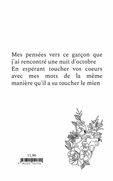 Ce livre regroupe mes pensées, vers cette personne si importante, que j'ai rencontré une nuit d'octobre.Ce garçon à rapidement rempli mon coeur d'amour, de projets et de souvenirs.Il est également celui qui m'a fait grandir, m'a fait voir la vie d'une autre façon, une facette tellement belle de la vie : celle de l'apprécier qu'importe les obstacles.Ce livre contient donc 5 parties qui suivent pas à pas les étapes d'une relation amoureuse.Conçu pour guérir vos coeurs et pour vous permettre d'enfin mettre des mots sur vos émotions.Mots-clés : Amour, passion, rupture, tristesse, colère.Interdit au moins de 14 ans.