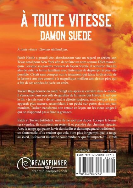 À toute vitesse : L'amour n'attend pas. Patch Hastle a grandi vite, abandonnant sans un regard en arrière son Texas natal pour New York afin de se faire un nom comme DJ et mannequin. Lorsque ses parents meurent de façon brutale, il retourne chez lui afin de vider la ferme familiale avec l'intention de déguerpir le plus vite possible. C'était sans compter sur le testament qui laisse la direction de la ferme à son pire ennemi : le magnifique meilleur ami de son père qui a fait de ses années de lycée un enfer. Tucker Biggs tourne en rond. Vingt ans après sa carrière dans le rodéo, il s'enracine…mehr