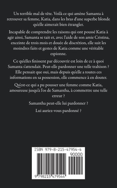 Un terrible mal de tête. Voilà ce qui amène Samanta à retrouver sa femme, Katia, dans les bras d'une superbe blonde qu'elle aimerait bien étrangler. Incapable de comprendre les raisons qui ont poussé Katia à agir ainsi, Samanta se tait et, avec l'aide de son amie Cristina, enceinte de trois mois et douée de discrétion, elle suit les moindres faits et gestes de Katia comme une véritable espionne. Ce qu'elles finissent par découvrir est loin de ce à quoi Samanta s'attendait. Peut-elle pardonner une telle trahison ? Elle pensait que oui, mais depuis qu'elle a toutes ces informations en sa possession, elle commence à en douter. Qu'est-ce qui a pu pousser une femme comme Katia, amoureuse jusqu'à l'os de Samantha, à commettre une telle erreur ? Samantha peut-elle lui pardonner ? Lui auriez-vous pardonné ?