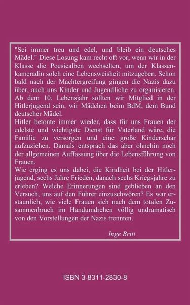 Sei immer treu und edel, und bleib ein deutsches Mädel." Diese Losung kam recht oft vor, wenn wir in der Klasse die Poesiealben wechselten, um der Klassenkameradin solch eine Lebensweisheit mitzugeben. Schon bald nach der Machtergreifung gingen die Nazis dazu über, auch uns Kinder und Jugendliche zu organisieren. Ab dem 10. Lebensjahr sollten wir Mitglied in der Hitlerjugend sein, wir Mädchen beim BdM, dem Bund deutscher Mädel. Hitler betonte immer wieder, dass für uns Frauen der edelste und wichtigste Dienst für Vaterland wäre, die Familie zu versorgen und eine große Kinderschar aufzuziehen. Damals entsprach das aber ohnehin noch der allgemeinen Auffassung über die Lebensführung von Frauen. Wie erging es uns dabei, die Kindheit bei der Hitlerjugend, sechs Jahre Frieden, danach sechs Kriegsjahre zu erleben? Welche Erinnerungen sind geblieben an den Versuch, uns auf den Führer einzuschwören? Es war erstaunlich, wie viele Frauen sich nach dem totalen Zusammenbruch im Handumdrehen völlig undramatisch von den Vorstellungen der Nazis trennten.
