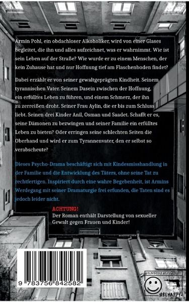 Armin Pohl, ein obdachloser Alkoholiker, wird von einer Glases begleitet, die ihn und alles aufzeichnet, was er wahrnimmt. Wie ist sein Leben auf der Straße? Wie wurde er zu einem Menschen, der kein Zuhause hat und nur Hoffnung tief am Flaschenboden findet?Dabei erzählt er von seiner gewaltgeprägten Kindheit. Seinem tyrannischen Vater. Seinem Dasein zwischen Hoffnung, ein erfülltes Leben zu führen, und einem Schmerz, der ihn zu zerreißen droht. Seiner Frau Aylin, die er bis zum Schluss liebt. Seinen drei Kinder Anil, Osman und Saadet. Schafft er es, seine Dämonen zu bezwingen und seiner Familie ein erfülltes Leben zu bieten? Oder erringen seine schlechten Seiten die Oberhand und wird er zum Tyrannenvater, den er selbst so verabscheute?Dieses Psycho-Drama beschäftigt sich mit Kindesmisshandlung in der Familie und die Entwicklung des Täters, ohne seine Tat zu rechtfertigen. Inspiriert durch eine wahre Begebenheit, ist Armins Werdegang mit seiner Dramaturgie frei erfunden, die Tatensind es jedoch leider nicht.Achtung!Der Roman enthält Darstellung von sexueller Gewalt gegen Frauen und Kinder!