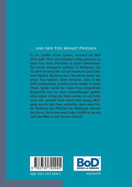 Er, ein Zyniker ersten Grades, verstand die Welt nicht mehr. Denn das Schicksal schlug grausam zu. Seine Frau Anita erkrankte an einen Gehirntumor. Der wurde erfolgreich entfernt. Er, Wolfgang, fast 70 Jahre alt versuchte sich als Hausmann und scheiterte kläglich. Wurde er doch Jahrzehnte immer von seiner Frau bedient. Seine Versuche, alles in den Griff zu bekommen, endeten immer wieder in einem Chaos. Später wurde bei seiner Frau Lungenkrebs festgestellt und mit einer Chemotherapie geheilt. Jahre später schlug der Krebs wieder zu und Anita starb sehr qualvoll. Doch damit nicht genug. Wolfgang musste sein Haus verkaufen, denn seine Kinder forderten das Pflichteil ein. Wolfgang zerbrach fast daran. Durch eine neue Liebe schaffte er gerade noch den Weg in eine bessere Zukunft.