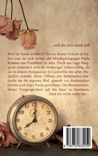 ... und die Zeit stand still Wer ist Paula wirklich? Bis zu ihrem Urlaub in Italien war sie sich sicher, die Musikpädagogin Paula Kramer aus Frankfurt zu sein. Doch am Lago Maggiore verändert sich ihr bisheriges Leben völlig, als sie in einem Antiquariat in Cannobio ein altes Medaillon ersteht. Beim Öffnen des Schmuckes entdeckt sie ihr eigenes Bild, gemalt vor dreihundert Jahren und einer Paola gewidmet. Die Besessenheit, dieser Vergangenheit auf die Spur zu kommen, lässt sie nicht mehr los ...