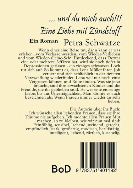Wenn einer eine Reise tut, dann kann er was erleben...vom Verlassenwerden, vom Wieder-Verlieben und vom Wieder-alleine-Sein.Entdeckend, dass Dexter eine oder mehrere Affären hat, wird sie noch tiefer in Depressionen gerissen - ein riesiges schwarzes Loch tut sich auf. So kommt es, dass Lena Müller ihren Job verliert und sich schließlich in der tiefsten Verzweiflung wiederfindet. Lena will nur noch eins: Vergessen können und Ruhe finden.Was sie jetzt braucht, sind ihre erwachsenen Kinder und die Freunde, die ihr geblieben sind. Es war eine einseitige Liebe, bis zur Unerträglichkeit. Man könnte es auch bezeichnen als: Wenn Frauen immer wieder zu sehr lieben.Die Autorin über ihr Buch:Ich wünsche allen liebenden Frauen, dass sie ihre Träume nie aufgeben. Ich möchte allen Frauen Mut machen, so zu bleiben, wie wir nun mal sind: Feinfühlig, sensibel, lachend, weinend, gerecht, empfindlich, stark, großartig, modisch, berufstätig, intelligent, liebend, zärtlich, kuschelig.