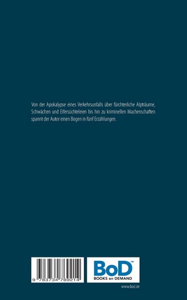 Von der Apokalypse eines Verkehrsunfalls über fürchterliche Alpträume, Schwächen und Eifersüchteleien bis hin zu kriminellen Machenschaften spannt der Autor einen Bogen in fünf Erzählungen.
