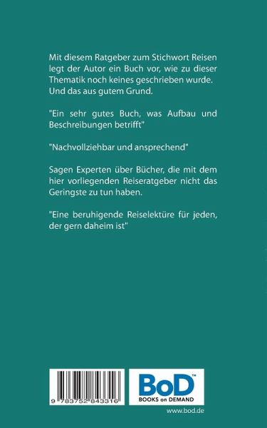 Mit diesem Ratgeber zum Stichwort Reisen legt der Autor ein Buch vor, wie zu dieser Thematik noch keines geschrieben wurde. Und das aus gutem Grund."Ein sehr gutes Buch, was Aufbau und Beschreibungen betrifft""Nachvollziehbar und ansprechend"Das sagen Experten über Bücher, die mit dem hier vorliegenden Reiseratgeber nicht das Geringste zu tun haben."Eine beruhigende Reiselektüre für jeden, der gern daheim ist"