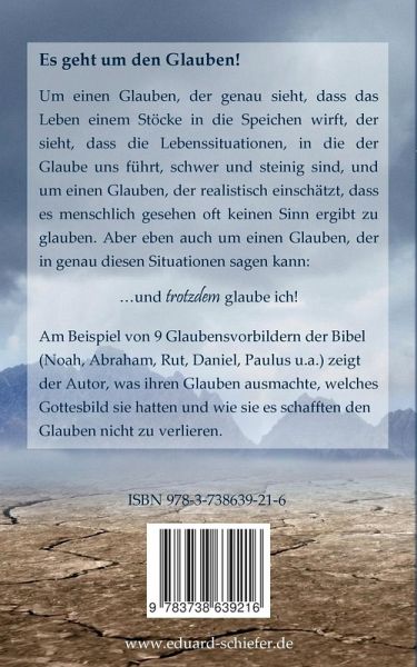 Es geht um den Glauben!Um einen Glauben, der genau sieht, dass das Leben einem Stöcke in die Speichen wirft, der sieht, dass die Lebenssituationen, in die der Glaube uns führt, schwer und steinig sind, und um einen Glauben, der realistisch einschätzt, dass der Glaube menschlich gesehen oft keinen Sinn ergibt. Aber eben auch um einen Glauben, der in genau diesen Situationen sagen kann: ...und trotzdem glaube ich!Am Beispiel von 9 Glaubensvorbildern der Bibel (Noah, Abraham, Rut, Daniel, Paulus u.a.) wird gezeigt, was ihren Glauben ausmachte, welches Gottesbild sie hatten und wie sie es schafften den Glauben nicht zu verlieren.