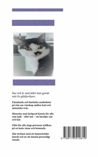 Två år med äldre katt som berikat mitt liv.. Episoder på rim och vers om vänskap mellan människa och katt under 23 månader Boken är uppbyggd av anekdoter och burlesker i mycket varm ton om dråpliga situationer i levnadens höstskymning. Bakom kåserande stil finns undertexten av hur mötet med en - i början reserverad - katt, gav författaren ökad livsglädje och rikare känslor. Ömsinta första varsamma närmanden skildras. Men även saknad av att mista en vän - "om än av annan art". Däremellan fångas en vardag av betydelse för författarens välbefinnande, som att lindra morgonens ångestsyndrom. I tonträff finns likheter med tidigare verk om samspelet mellan människa och katt - som J Boven Gatukatten Bok och N Uddenberg Gubbe och katt. Uttryck och stil hämtar inspiration från Bellman, Hasse &Tage och Vreeswijk. Författaren förmedlar sina minnen med hjälp av gammaldags rim. Utan anspråk av att distansera sig till läsare i avancerad formuleringskonst eller diktform. Visst hum om litteratur och visa är dock en fördel för att förstå underfundigheter. Anekdoter med schwung vänder sig till följande läsare, och finns på baksidan: "Historier i feelgood-känsla till alla som haft - eller har - ett husdjur kär. Eller för all slags personer nyfikna på en katts sinne och beteende. Här tecknat med ett humoristiskt leende och ur ett personligt seende". Målgrupp är läsare med viss bildning och kattintresse, eller har minnen från uppväxtår med katt - vilket tillsammans torde vara flera hundra tusen i vårt land. Boken är passande gåva - för de som vill visa mer fantasi - vid bjudningar och andra gåvotillfällen. Som vid examen till mer avlägsen bekant, och där mottagaren har känt kattintresse. Lämpligt försäljningspris är jämförelsen en flaska vin eller en bukett blommor som gåva vid dessa tillfällen. Sålunda ett pris i butik mellan 79 kr och 139 kr.