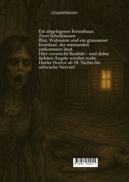 Mein Buch ist ein fesselnder Horrorroman ab 18 Jahren, der eine Schulklasse auf Klassenfahrt in ein abgelegenes Wald-Ferienhaus begleitet. Was als harmlose Reise beginnt, entwickelt sich zu einem albtraumhaften Trip durch Raum und Zeit. Übernatürliche Phänomene, blutige Visionen, mysteriöse Todesfälle und unentrinnbare Zeitschleifen lassen Realität und Wahnsinn verschwimmen. Kapitel für Kapitel entfaltet sich ein düsteres Geheimnis, das eng mit dem Ort und seinen unheimlichen Bewohnern verknüpft ist. Mit jeder Seite wächst die Spannung - bis zum überraschenden, beklemmenden Ende, das Raum für einen zweiten Teil lässt.