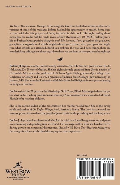 Bobbie J Hays is a mother, minister, early retired teacher. She has two grown sons, Thado Nakia and Dr. Terrance Nathan. She has eight adorable grandchildren. She is a native of Clarksdale, MS, where she graduated H.S. from Aggie High; graduated Jr. College from Coahoma Jr. College and is a 1972 graduate of Jackson State College (now university) in Jackson, MS. She attended University of Mobile School of Religion for two years majoring in Religious Studies. Bobbie resided for 27 years on the Mississippi Gulf Coast, Biloxi, Mississippi where she got her start in the teaching profession and ministry. After retirement she moved to Lakeland, Florida to be near her children. She is the second oldest of the ten children her mother would bear. She is the newly published author of On Eagles' Wings: Faith, Fortitude, Family. The Lord has awarded her many opportunities to share the gospel of Jesus Christ in the preaching and teaching arena. Bobbie J Hays, who has a heart for the broken in spirit, has found her greatest joy and peace in communing and spending time with God. Her messages reflect what she has discovered during private time spent in His presence. Ideas for We Have This Treasure: Messages to Encourage the Heart was birthed during a quiet time experience.