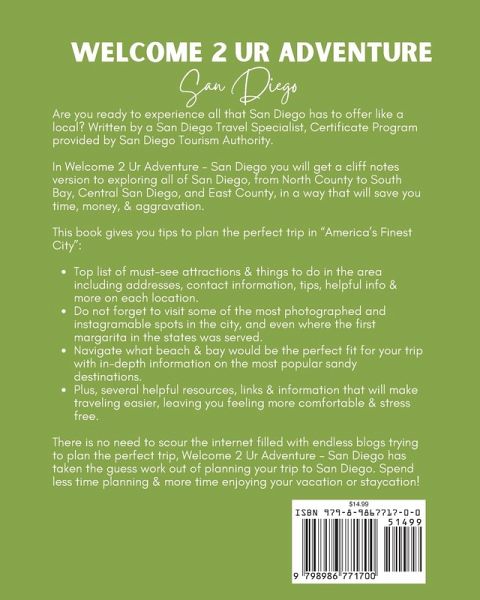 Welcome 2 Ur Adventure-San Diego is a comprehensive, cliff notes version to exploring all of San Diego, from North County to South Bay, Central San Diego, and East County, in a way that will save you time, money, & aggravation; written by a long time San Diego local. This book gives you tips to plan the perfect trip in "America's Finest City": There is no need to scour the internet filled with endless blogs trying to plan the perfect trip, Welcome 2 Ur Adventure-San Diego has taken the guess work out of planning your trip to San Diego. Spend less time planning & more time enjoying your vacation or staycation! Do not forget to visit some of the most photographed and instagramable spots in the city, and where the first margarita in the states was served Navigate what beach & bay would be the perfect fit for your trip with in-depth information on the most popular sandy destinations. Plus, free, helpful resources, links & information that will make traveling easier, leaving you feeling more comfortable & stress free. Are you ready to experience all that San Diego has to offer like a local?