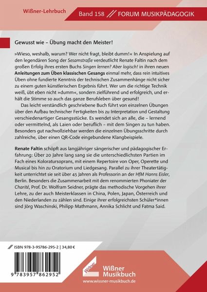 »Wieso, weshalb, warum? Wer nicht fragt, bleibt dumm!« In Anspielung auf den legendären Song der Sesamstraße verdeutlicht Renate Faltin nach dem großen Erfolg ihres ersten Buchs »Singen lernen? Aber logisch!« in ihren neuen »Anleitungen zum Üben klassischen Gesangs« einmal mehr, dass rein intuitives Üben ohne fundierte Kenntnis der technischen Zusammenhänge nicht sicher zu einem guten künstlerischen Ergebnis führt. Wer um die richtige Technik weiß, übt eben nicht »dumm«, sondern zielführend und erfolgreich, und erhält die Stimme so auch das ganze Berufsleben über gesund!Das leicht verständlich geschriebene Buch führt von einzelnen Übungen über den Aufbau technischer Fertigkeiten bis zu Interpretation und Gestaltung verschiedenartiger Gesangsstücke. Es wendet sich an alle, die - lernend oder vermittelnd, als Laien oder beruflich - mit dem Singen zu tun haben. Besonders gut nachvollziehbar werden die einzelnen Übungsschritte durch zahlreiche, über einen QR-Code eingebundene Klangbeispiele.