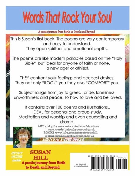 A stunning and soul searching book of poetry in the form of parables. You will find answers to what and who YOU are. You will find an awareness that you are loved. many characters inhabit this book. Some loving some cruel. The word images will make you laugh or cry or ponder your destiny. Symbolism in words about greed,envy,lust passion and pain envelope you. The poems lead you on a spiritual journey from the beginnings of awareness to fulfillment in God Almighty and Jesus Christ This book is not slushy or sentimental.But powerful and modern. Biblical yet very human. Wonderful for Christian or non. Someone of any faith or none. Easy language but with powerfull concepts.Superb for helping in counselling and healing emotions.Superb for self awareness and self development. NOT AN ORDINARY BOOK. Study guide incorporated and also wonderful black and white original illustrations. ENJOY DIRECT/CHEAPER from author. please e mail susan_hill48@yahoo.co.uk