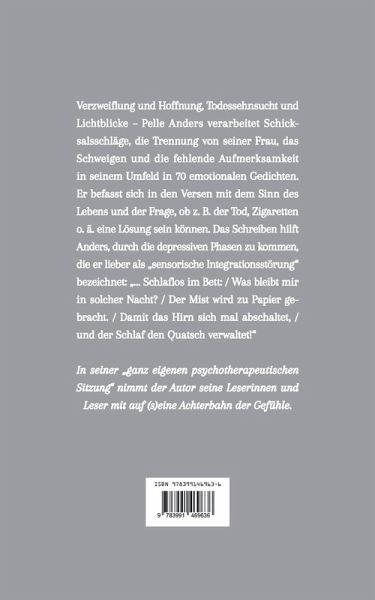Verzweiflung und Hoffnung, Todessehnsucht und Lichtblicke - Pelle Anders verarbeitet Schicksalsschläge, die Trennung von seiner Frau, das Schweigen und die fehlende Aufmerksamkeit in seinem Umfeld in 70 emotionalen Gedichten. Er befasst sich in den Versen mit dem Sinn des Lebens und der Frage, ob z. B. der Tod, Zigaretten o. ä. eine Lösung sein können. Das Schreiben hilft Anders, durch die depressiven Phasen zu kommen, die er lieber als "sensorische Integrationsstörung" bezeichnet: "... Schlaflos im Bett: / Was bleibt mir in solcher Nacht? / Der Mist wird zu Papier gebracht. / Damit das Hirn sich mal abschaltet, / und der Schlaf den Quatsch verwaltet!" In seiner "ganz eigenen psychotherapeutischen Sitzung" nimmt der Autor seine Leserinnen und Leser mit auf (s)eine Achterbahn der Gefühle.