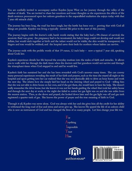 You are cordially invited to accompany author Kayden Jayne West on her journey through the valley of the shadow of death. You are invited to share her emotions and inner thoughts as she experiences the effects of the death sentence pronounced upon her unborn grandson to the unparalleled exaltation she enjoys today with that 7 year old miracle child. The journey has been long, the road has been rough, but the battle has been won - proving that with God all things are possible. Kayden was living a typically normal life prior to the start of this journey. The journey begins with the doctor's cold, harsh words stating that the baby had a 0% chance of survival; the amniotic fluid was gone; the pregnancy had to be terminated, the baby's lungs could not develop and would not inflate, but would stick together at birth and the infant would not be viable; the skin would be transparent; the fingers and toes would be webbed; and the hospital saves their beds for mothers whose babies can survive. The journey ends with the prolific words of that 19 ounce, 12 inch baby - now a typical 7 year old, speaking about Gods law. Kayden's experience details her life beyond the everyday routines into the realm of faith and miracles. It allows you to walk with her through the dark times when the doctors said her grandson would not survive and through the triumphant times when God stepped in and said he would live. Kayden's faith has sustained her and she has been rewarded with God's answers many times. She can convey many personal experiences revealing the result of her faith and prayers, such as the time she stayed all night at the hospital and upon getting into her car realized that she was not physically able to drive an hour home and work the next day. She relates how she simply laid her head on the steering wheel and prayed to God - telling him that she was not able to drive home on her own, and if she got there, she would have to have his help. She doesn't really remember the drive home, but she knows it was not her hands guiding the wheel that took her safety home and through the next day at work; or the night she failed to notice her gas light was on and she was miles from the nearest station. Then, as she drove and prayed, she looked down later and the gas light was off and gas tank registered a quarter tank of gas. She knows the power of prayer and the true meaning of faith in God. Through it all, Kayden was never alone. God was always with her and she gives him all the credit for her ability to withstand the long road of fear and stress and never give up. She knows He spared the life of an unborn child who is now an instrument of God has changed the lives of so many people. Let him change your life too.