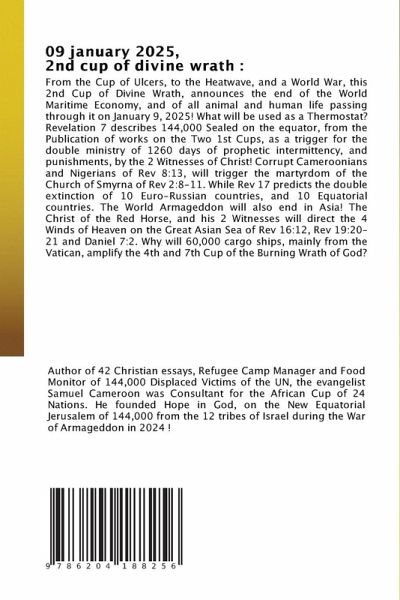From the Cup of Ulcers, to the Heatwave, and a World War, this 2nd Cup of Divine Wrath, announces the end of the World Maritime Economy, and of all animal and human life passing through it on January 9, 2025! What will be used as a Thermostat? Revelation 7 describes 144,000 Sealed on the equator, from the Publication of works on the Two 1st Cups, as a trigger for the double ministry of 1260 days of prophetic intermittency, and punishments, by the 2 Witnesses of Christ! Corrupt Cameroonians and Nigerians of Rev 8:13, will trigger the martyrdom of the Church of Smyrna of Rev 2:8-11. While Rev 17 predicts the double extinction of 10 Euro-Russian countries, and 10 Equatorial countries. The World Armageddon will also end in Asia! The Christ of the Red Horse, and his 2 Witnesses will direct the 4 Winds of Heaven on the Great Asian Sea of Rev 16:12, Rev 19:20-21 and Daniel 7:2. Why will 60,000 cargo ships, mainly from the Vatican, amplify the 4th and 7th Cup of the Burning Wrath of God?
