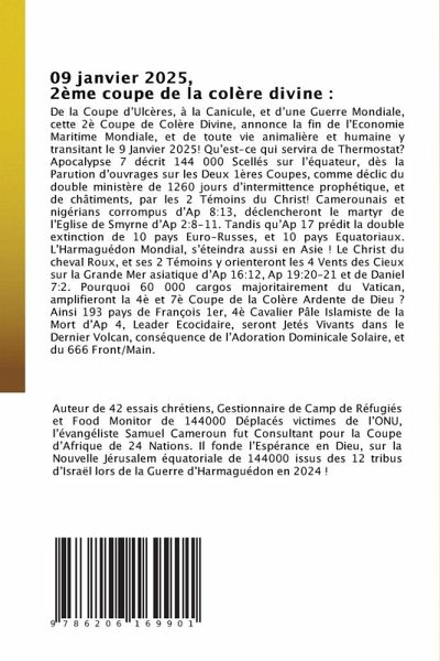 De la Coupe d'Ulcères, à la Canicule, et d'une Guerre Mondiale, cette 2è Coupe de Colère Divine, annonce la fin de l'Economie Maritime Mondiale, et de toute vie animalière et humaine y transitant le 9 Janvier 2025! Qu'est-ce qui servira de Thermostat? Apocalypse 7 décrit 144 000 Scellés sur l'équateur, dès la Parution d'ouvrages sur les Deux 1ères Coupes, comme déclic du double ministère de 1260 jours d'intermittence prophétique, et de châtiments, par les 2 Témoins du Christ! Camerounais et nigérians corrompus d'Ap 8:13, déclencheront le martyr de l'Eglise de Smyrne d'Ap 2:8-11. Tandis qu'Ap 17 prédit la double extinction de 10 pays Euro-Russes, et 10 pays Equatoriaux. L'Harmaguédon Mondial, s'éteindra aussi en Asie ! Le Christ du cheval Roux, et ses 2 Témoins y orienteront les 4 Vents des Cieux sur la Grande Mer asiatique d'Ap 16:12, Ap 19:20-21 et de Daniel 7:2. Pourquoi 60 000 cargos majoritairement du Vatican, amplifieront la 4è et 7è Coupe de la Colère Ardente de Dieu ? Ainsi 193 pays de François 1er, 4è Cavalier Pâle Islamiste de la Mort d'Ap 4, Leader Ecocidaire, seront Jetés Vivants dans le Dernier Volcan, conséquence de l'Adoration Dominicale Solaire, et du 666 Front/Main.