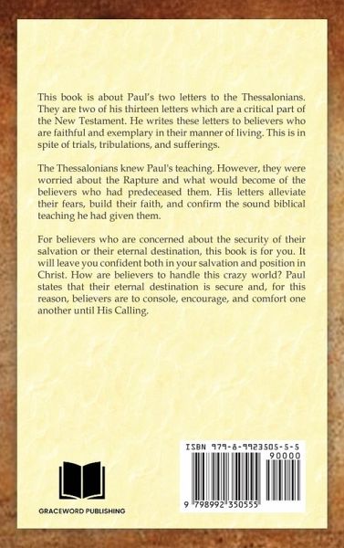 This book is about Paul's two letters to the Thessalonians. They are two of his thirteen letters which are a critical part of the New Testament. He writes these letters to believers who are faithful and exemplary in their manner of living. This is in spite of trials, tribulations, and sufferings. The Thessalonians knew Paul's teaching. However, they were worried about the Rapture and what would become of the believers who had predeceased them. His letters alleviate their fears, build their faith, and confirm the sound biblical teaching he had given them. For believers who are concerned about the security of their salvation or their eternal destination, this book is for you. It will leave you confident both in your salvation and position in Christ. How are believers to handle this crazy world? Paul states that their eternal destination is secure and, for this reason, believers are to console, encourage, and comfort one another until His Calling.