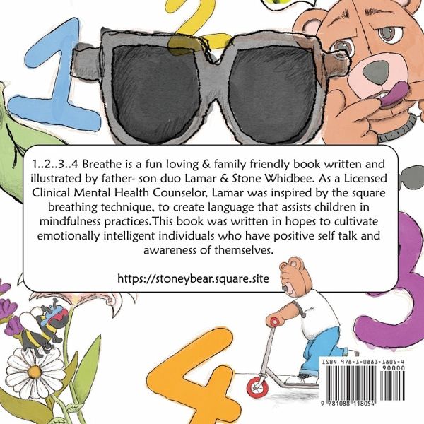 1..2..3..4 Breathe is a fun loving & family friendly book written and illustrated by father- son duo Lamar & Stone Whidbee. As a Licensed Clinical Mental Health Counselor, Lamar was inspired by the square breathing technique, to create language that assist children in mindfulness practices.This book was written in hopes to cultivate emotionally intelligent individuals who have positive self talk and awareness of themselves.