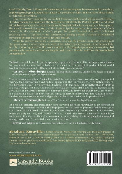 1 and 2 Timothy, Titus: A Theological Commentary for Preachers engages hermeneutics for preaching, employing theological exegesis that enables the preacher to utilize all the units of these epistles to craft effective sermons. This commentary unpacks the crucial link between Scripture and application: the theology of each preaching text (pericope). The three letters--collectively, the Pastoral Epistles--are divided into eighteen pericopes, and what the author is doing with what he is saying in each is explored. The overall theological trajectory of the Pastoral Epistles concerns the promotion of God's economy by the community of God's people. The specific theological thrust of individual preaching units is captured in this commentary, making possible a sequential homiletical movement through each pericope of the three epistles. While the primary goal of the commentary is to take the preacher from text to theology, it also provides two sermon outlines for each of the eighteen preaching units of the Pastoral Epistles. The unique approach of this work results in a theology-for-preaching commentary that promises to be useful for anyone teaching through 1 and 2 Timothy and Titus with an emphasis on application.