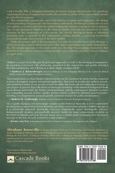 1 and 2 Timothy, Titus: A Theological Commentary for Preachers engages hermeneutics for preaching, employing theological exegesis that enables the preacher to utilize all the units of these epistles to craft effective sermons. This commentary unpacks the crucial link between Scripture and application: the theology of each preaching text (pericope). The three letters--collectively, the Pastoral Epistles--are divided into eighteen pericopes, and what the author is doing with what he is saying in each is explored. The overall theological trajectory of the Pastoral Epistles concerns the promotion of God's economy by the community of God's people. The specific theological thrust of individual preaching units is captured in this commentary, making possible a sequential homiletical movement through each pericope of the three epistles. While the primary goal of the commentary is to take the preacher from text to theology, it also provides two sermon outlines for each of the eighteen preaching units of the Pastoral Epistles. The unique approach of this work results in a theology-for-preaching commentary that promises to be useful for anyone teaching through 1 and 2 Timothy and Titus with an emphasis on application.