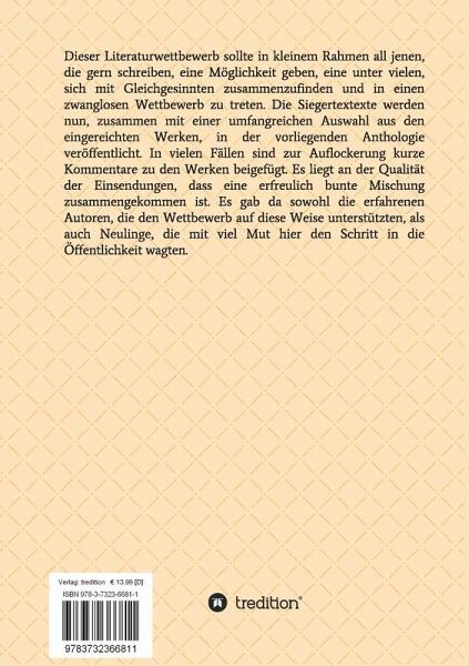 Dieser Literaturwettbewerb sollte in kleinem Rahmen all jenen, die gern schreiben, eine Möglichkeit geben, eine unter vielen, sich mit Gleichgesinnten zusammenzufinden und in einen zwanglosen Wettbewerb zu treten. Die Siegertextexte werden nun, zusammen mit einer umfangreichen Auswahl aus den eingereichten Werken, in der vorliegenden Anthologie veröffentlicht. In vielen Fällen sind zur Auflockerung kurze Kommentare zu den Werken beigefügt. Es liegt an der Qualität der Einsendungen, dass eine erfreulich bunte Mischung zusammengekommen ist. Es gab da sowohl die erfahrenen Autoren, die den Wettbewerb auf diese Weise unterstützten, als auch Neulinge, die mit viel Mut hier den Schritt in die Öffentlichkeit wagten.